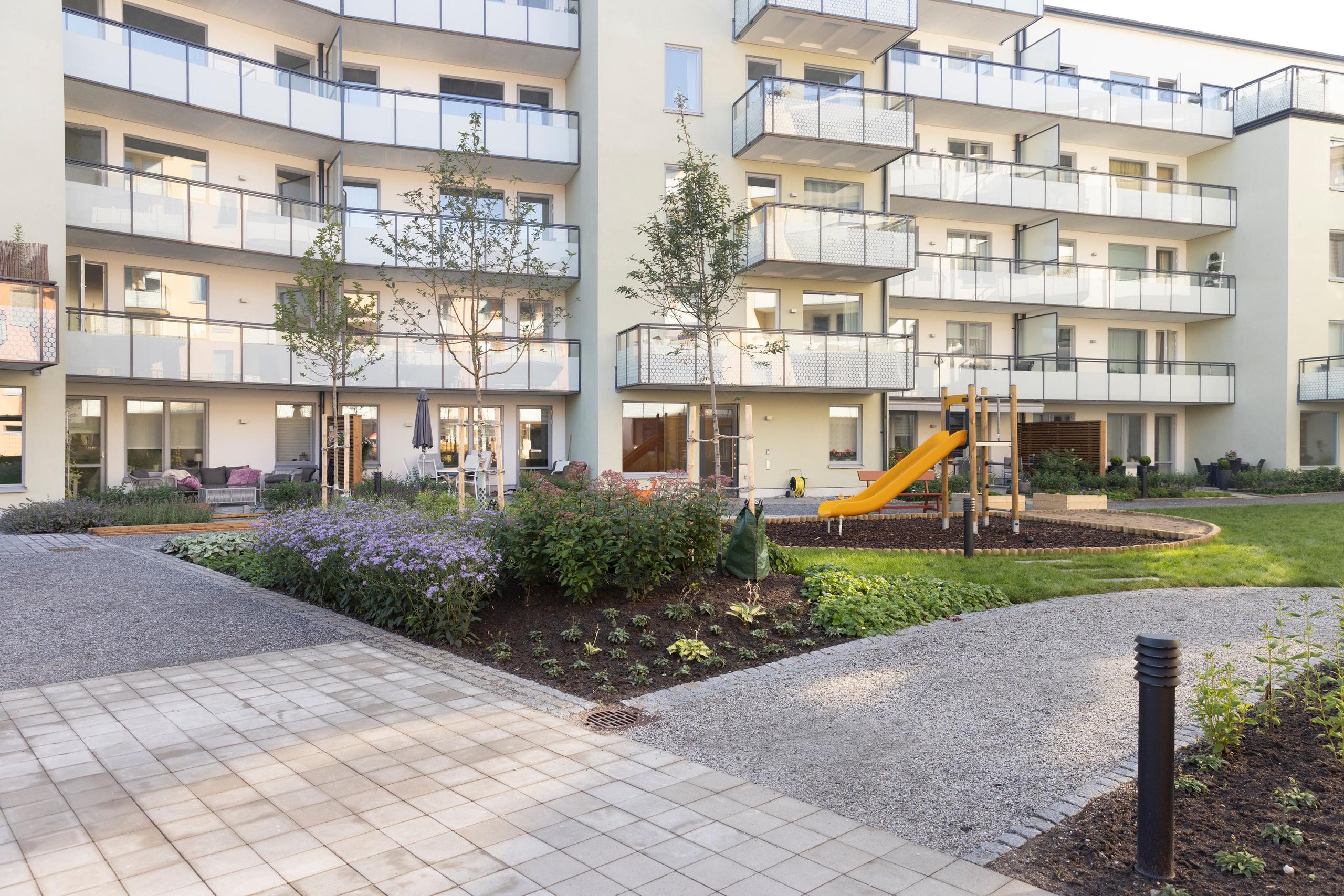 Alla bostäder har balkong eller uteplats mot innergården. Dessutom har några lägenheter en terrass på översta plan