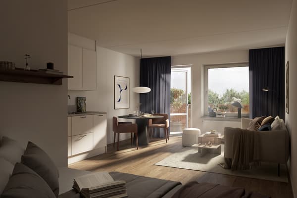 Här välkomnas du in i hall med skjutdörrsgarderob för förvaring av dina ytterkläder. Från hallen når du direkt det rymliga och stilrent inredda badrummet. Vidare in i lägenheten kommer du in i hjärtat av lägenheten som öppnar upp i en praktisk öppen planlösning mellan kök och vardagsrum. I de väl tilltagna sociala delarna finns plats för både soffgrupp och matplats. Här finns även en smart placerad sovalkov så du får undan sängen på ett bra sätt.