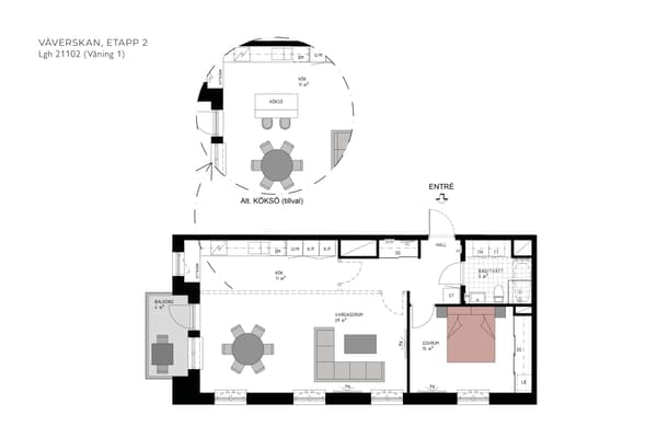 Köket går i vinkel och har gott om skåp och lådor med släta stilrena luckor. De fina bänkskivorna är av stenkomposit vilket ger ytorna ett mjukt intryck. Köket är fullt utrustat med både ugn och micro i högskåp, diskmaskinen är integrerad och även kyl/frys kan fås i det utförande om man önskar. Induktionshäll och vitvaror är utvalda med kvalitet och energibesparing i fokus.
