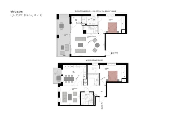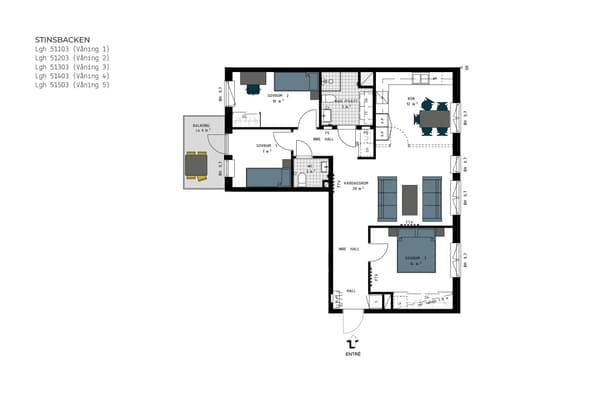 Lägenhetens sovrum ligger intill varandra, avskilt från de sociala ytorna. Möjlighet finns att välja bort ett av sovrummen och ge plats åt ett allrum där även balkongdörren är placerad. Master bedroom är luftigt om 14 kvm med en rymlig skjutdörrsgarderob.