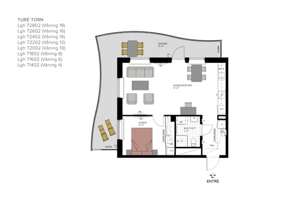 Möblerbar hall med bra förvaring i skjutdörrsgarderob. Vidare in i lägenheten finner du kök och vardagsrum i öppen planlösning. Från vardagsrummet finns utgången till lägenhetens stora balkong som har plats för en matgrupp. Köket är inrett med släta vita luckor och grå bänkskiva, rostfria energieffektiva vitvaror som delad kyl/frys, helintegrerad diskmaskin, induktionshäll och fläkt, samt ugn. Rymligt sovrum med plats för dubbelsäng och gott om förvaring i form av stor skjutdörrsgarderob med linnebackar. Lägenhetens badrum med vitt kakel och grå klinker är utrustat med wc och glasad duschhörna, kombimaskin med bänkskiva och väggskåp ovanför.
