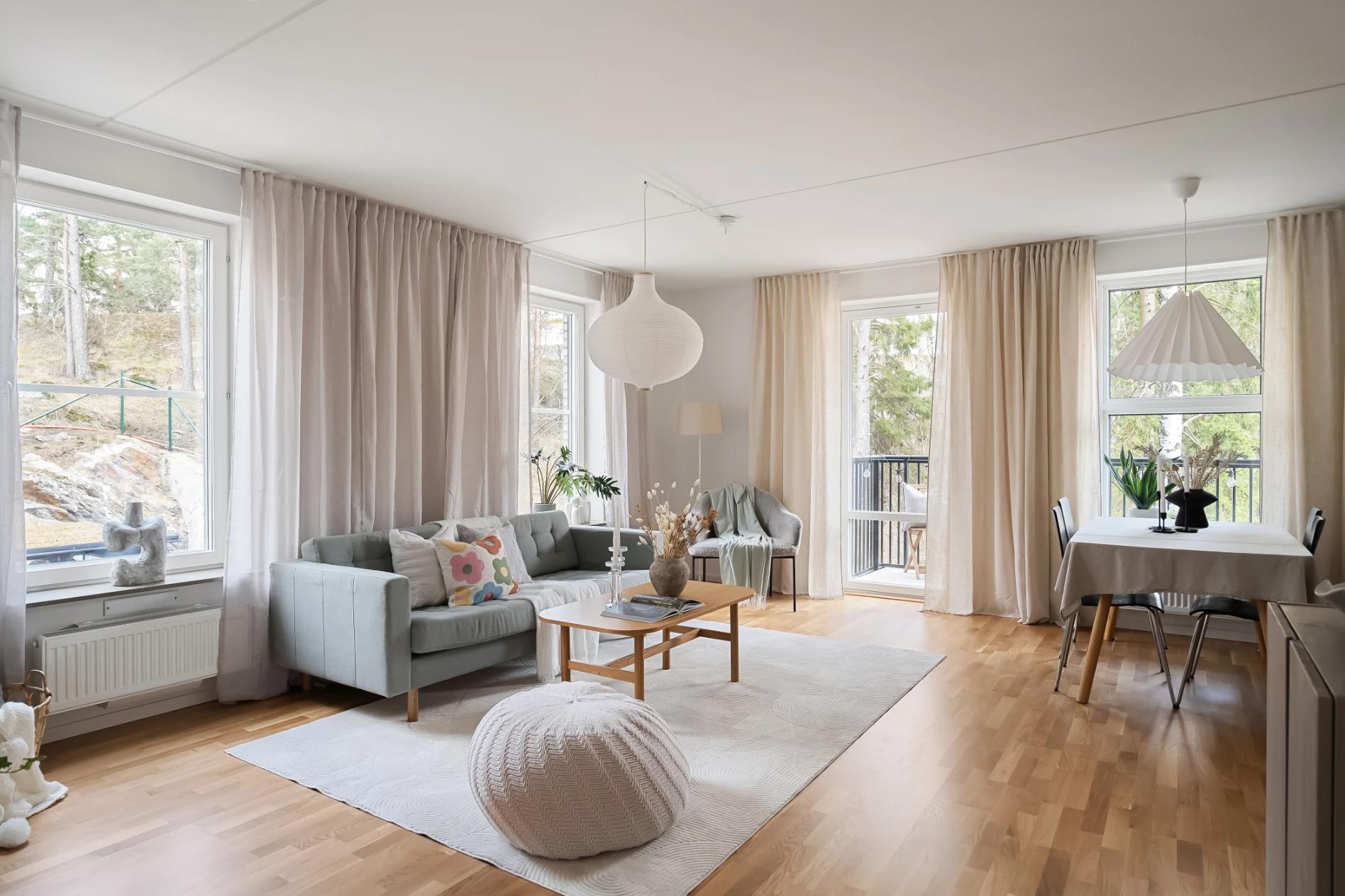 Här är en smart hörnlägenhet på 55 kvadratmeter med två rum och kök. Den kan enkelt få ett extra sovrum och bli en trea. Den ligger på andra våningen i hörnet av huset med utsikt både mot skogen och föreningens egna lugna gård samt mot gatan. Planlösningen är verkligen utmärkt och varje kvadratmeter är väl utnyttjad.