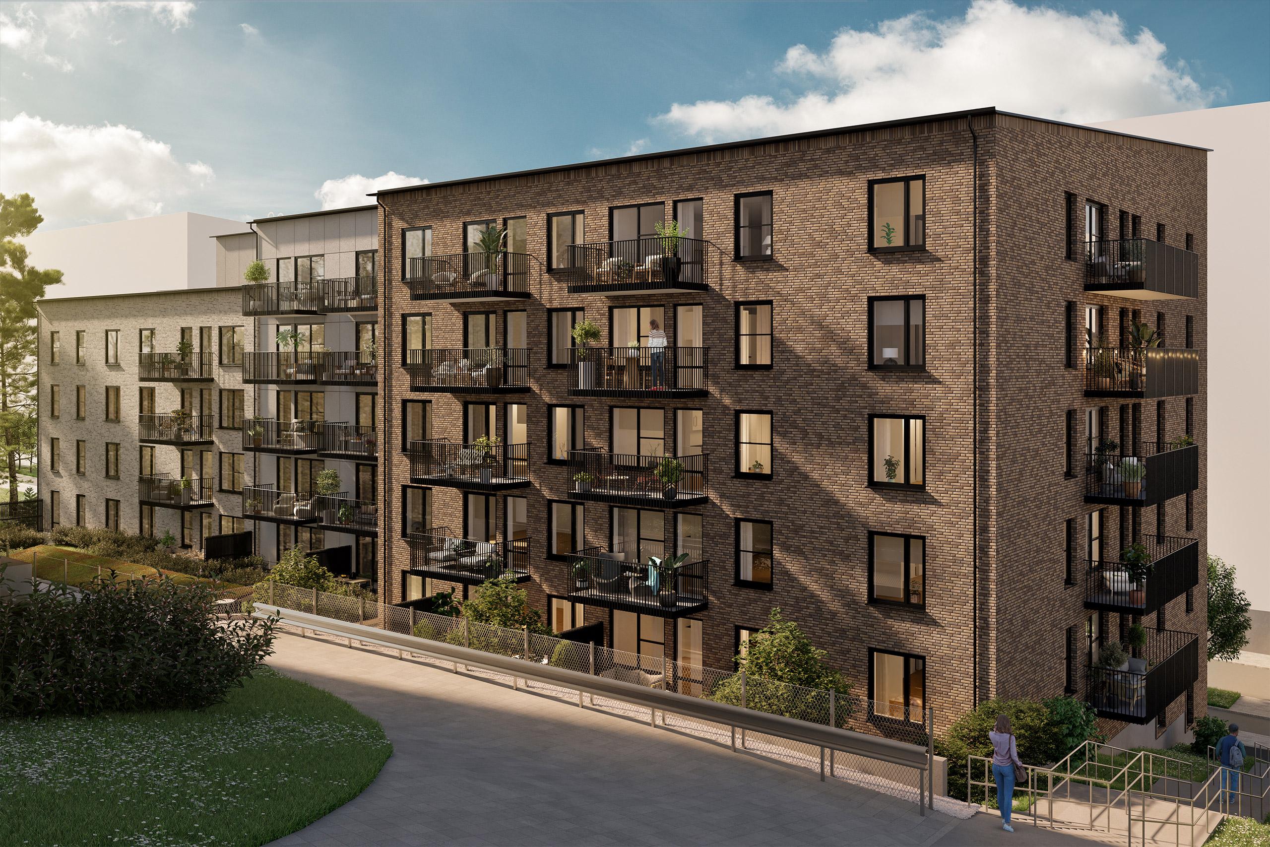 Majoriteten av alla bostäder har balkong eller uteplats. Ovanför garaget på bottenplan finns en gemensam, grönskande innergård, skapad för umgänge.
